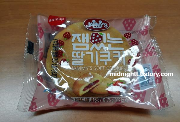 재미스 딸기잼이 16.87% 함유돼있다고 합니다. 유통기한은 포장지에 적혀있습니다. 사진으로 알 수 있듯이 초코보다 딸기잼이 쿠키 안에 더 두껍게 들어있습니다. 딸기잼도 쿠키의 겉 가까이 들어있어서 한가운데까지 베어 물지 않아도 딸기잼과 쿠키의 맛을 느낄 수 있습니다. 딸기잼은 흔히 아는 새콤달콤한 딸기잼 맛이었습니다. 가끔 잼을 먹으면 덩어리가 느껴지는 경우도 있는데 이 딸기 쿠키를 먹을 때는 덩어리가 씹히는 느낌은 없었습니다.