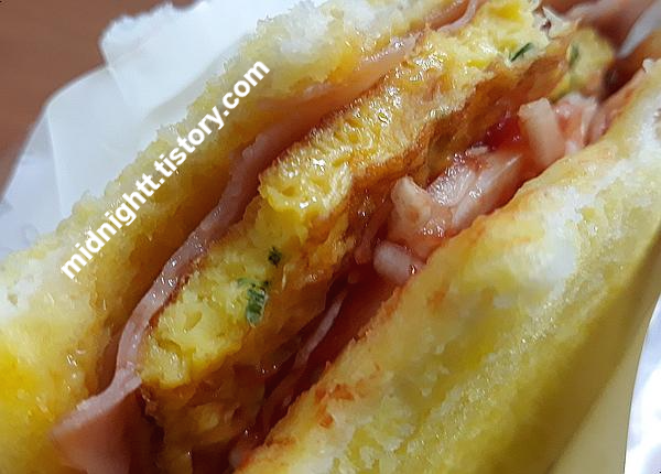 식빵은 노란빛의 프렌치토스트입니다. 달달한 맛이 느껴지는데 달달황설탕이 뿌려졌다고 합니다. 그냥 토스트겠거니, 하고 먹는데 양배추&케첩 샐러드가& 나와서 의외라고 생각했습니다. 따뜻한 케첩과 양배추.. 야채 계란은 네모 반듯하고 어느 정도 두께감 있게 들어있어서 좋았습니다. 치즈 소스&치즈 소스&치즈가 들어있어서 치즈 특유의 고소한 맛을 느낄 수 있었습니다. 토스트 속이 알차게 이것저것 채워져 있어서 간단하게 식사 대용으로 먹기 괜찮았습니다.